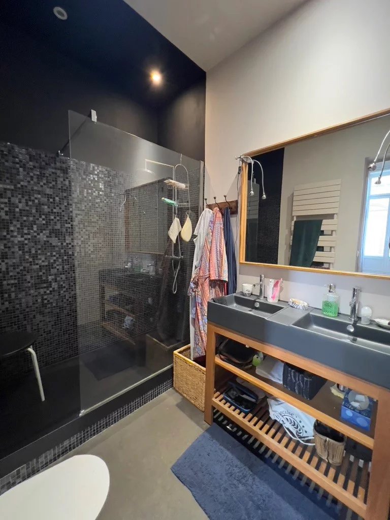 équipée et aménagée, trois chambres dont deux avec leurs salles de bain, ainsi qu’un WC séparé.